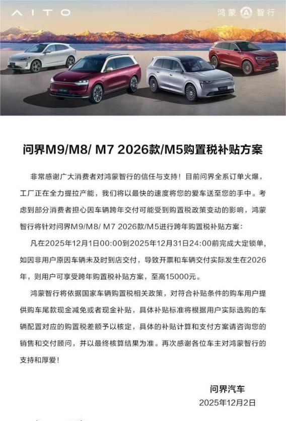 年终岁末,正是全家规划新车、解锁品质出行的好时机,但跨年交付可能面临的购置税政策变动,让不少家庭消费者举棋不定。12月2日,问界M8重磅推出年终购置税补贴政策,以满满诚意打消用户顾虑,让家庭购车更安心、出行更无忧!